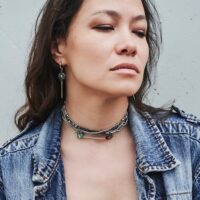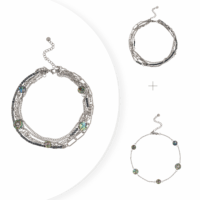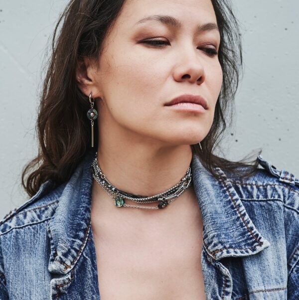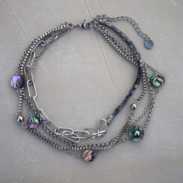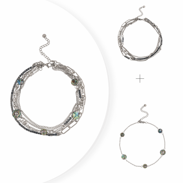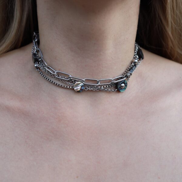 Steel chip and hematite “Chameleon” with round chokers — a multifunctional steel accessory featuring a pendant element. Modern in style with natural touches, safe, elegant, and durable.